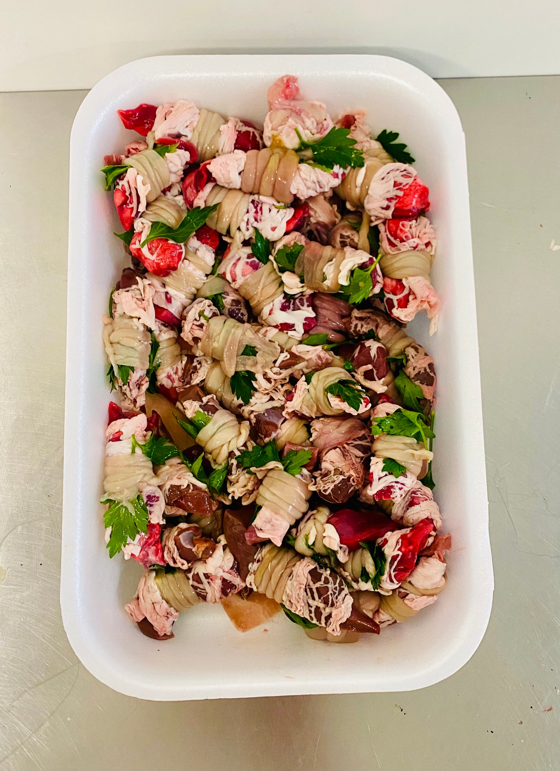 Interiora di agnello , fegato, cuore, milza, polmone e animella, avvolte da rete e budella di agnello. Più comunemente chiamati GNUGMIRED, una vera delizia barese.